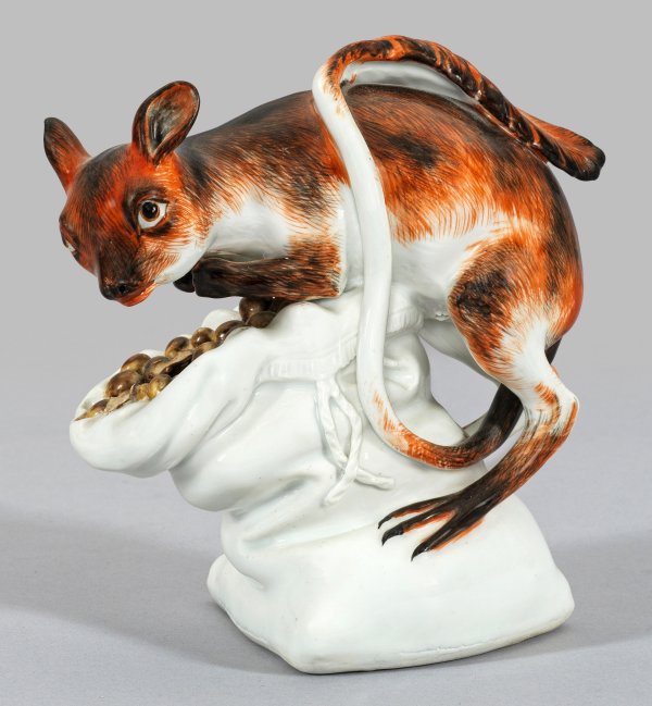 bzw. Afrikanische Wüstenspringmaus. An einem mit Haselnüssen gefüllten Sack sitzende Maus, ertappt im Moment der Futteraufnahme, der lange Schwanz über dem Rücken liegend. Polychrome Malerei (später) mit feiner Fellzeichnung. Entw. Johann Joachim Kaendler, 1735. Ger. herstellungbed. Spannungsrisse. Minim. rest.; H. 17 cm.