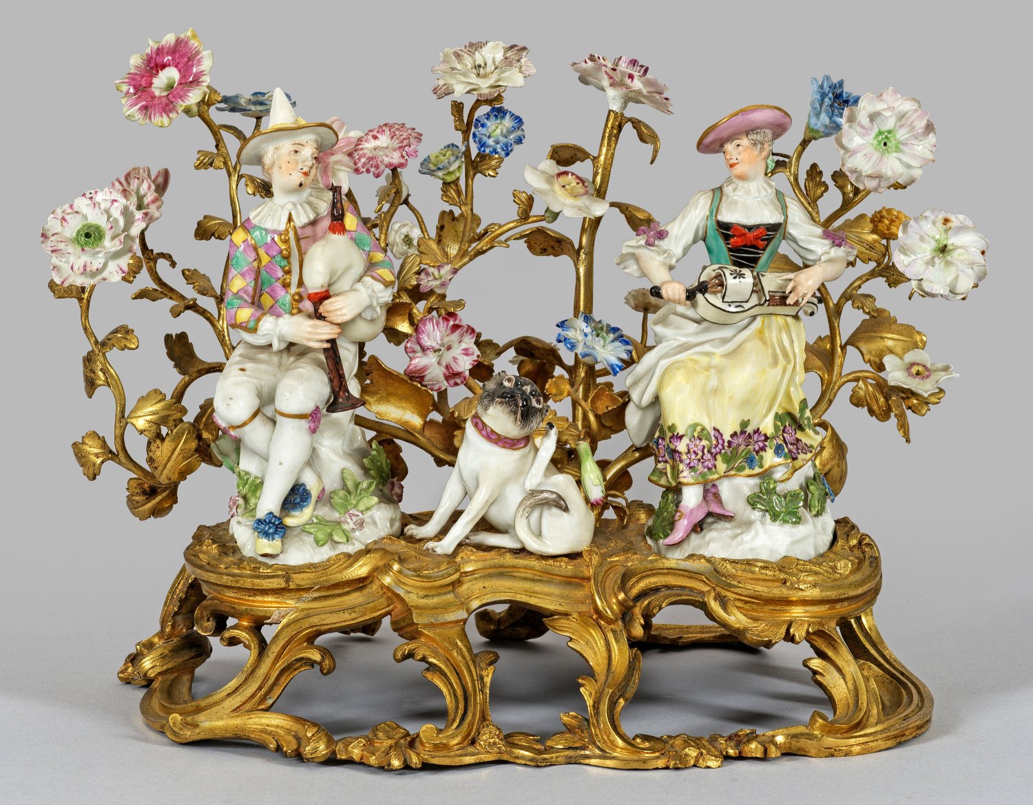 auf vergoldeter Bronzemontierung. Von großen, reliefplastischen Voluten getragener, durchbrochen gearbeiteter, ovaler Sockel. Seitlich zwei Einlassungen für Porzellanfiguren. Auf felsiger, mit Blättern und Blüten belegter Anhöhe sitzender, junger Harlekin mit Dudelsack. Als Gegenstück junge Tirolerin (bzw. Columbine) in sommerlicher Tracht, eine Drehleier spielend. Rücks. aufsteigende Äste mit filigran geformten, farblich staffierten sog. Vincennes-Blüten. Zentral sitzender Mops mit erhobener Pfote. Polychrome Malerei mit Goldstaffage. Entw. Johann Joachim Kaendler. Unw. rest.; Minim. best.; Figuren-H. 5,5 cm - 14 cm. Ges.-H. 19 cm. B. 27,5 cm.