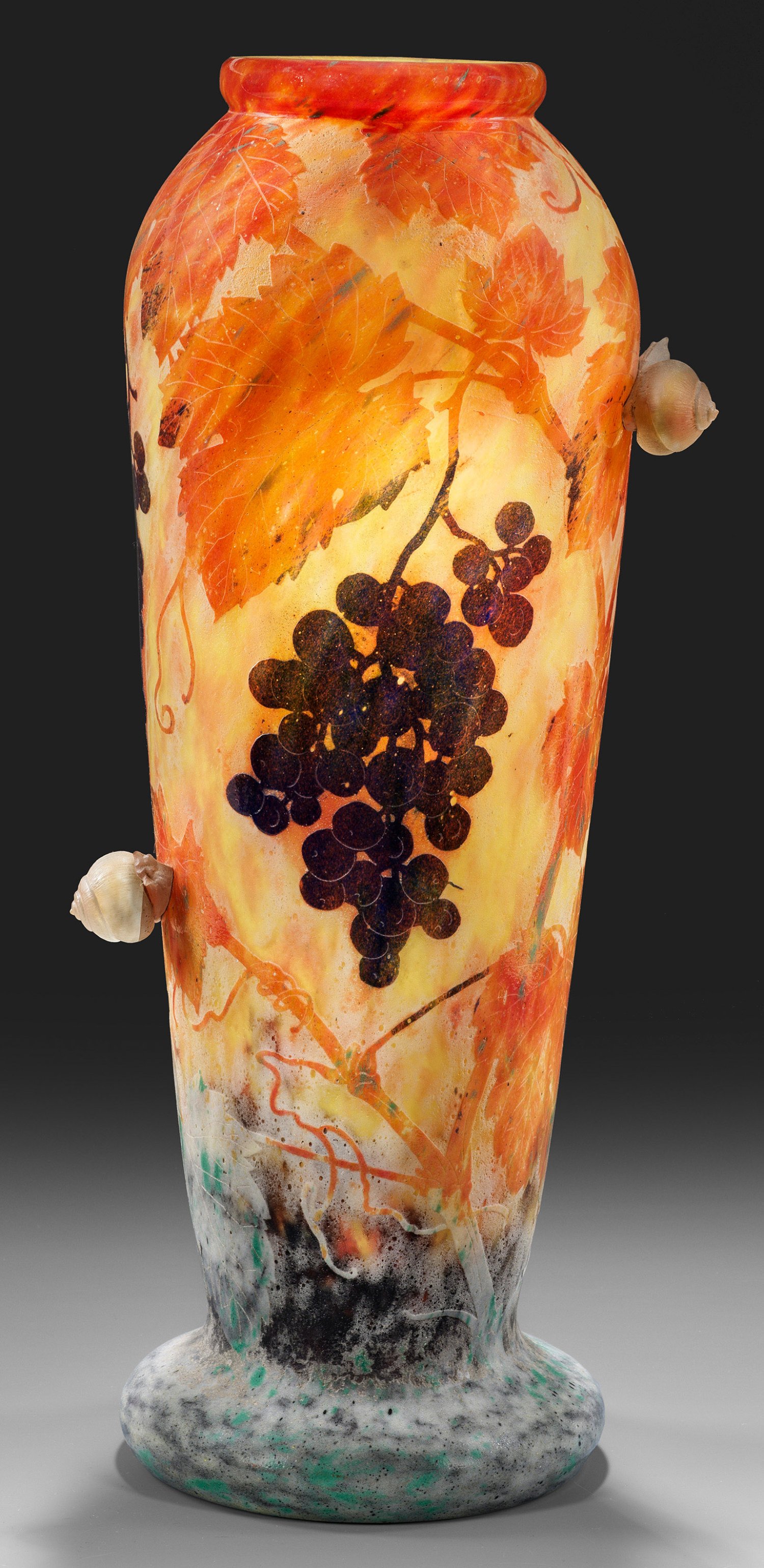 Kolbenform auf ausgestelltem Fuß. Überfangglas mit farbigen Pulvereinschmelzungen und -aufschmelzungen in Gelb, Orange, Dunkelviolett, weißgrauen und grünen Tönen. Aufwändig gestaltet mit geätztem Dekor aus herbstlichen Weinranken mit Blättern und reifen, dunklen Trauben, kombiniert mit zwei plastischen Applikationen in Gestalt von Weinbergschnecken. Entw. Henri Bergé, 1904. Geätzte Sign. "DAUM NANCY" in Verbindung mit Lothringer Kreuz. H. 45,2 cm.