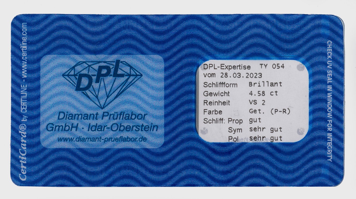 Brilliant solitaire approx. 4,58 ct. (P-R/vs2). Certificate included.