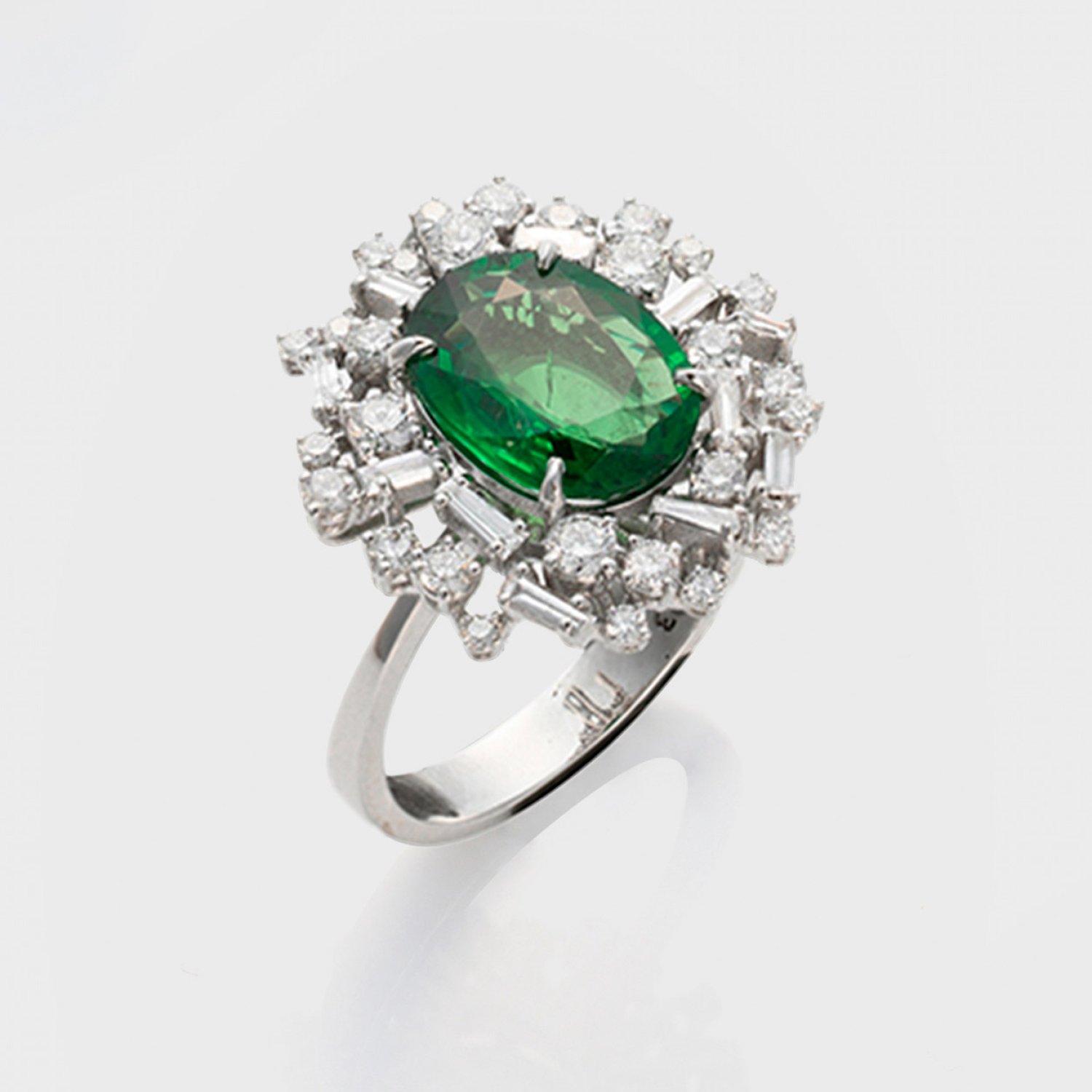 Weißgold, gest. 750. Zentral besetzt mit einem unbehandelten Vivid Green Tsavorit von ca. 3,32 ct., entouriert von Brillanten von zus. ca. 0,93 ct. (H/si). Gew. ca. 5,97 g.