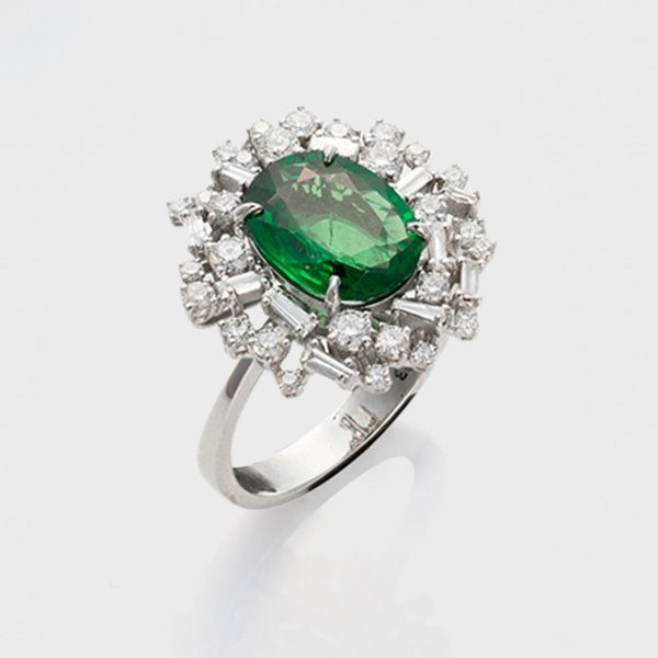 Ring set with a vivid green tsavorite (no treatment) approx. 3,32 ct. and diamonds approx. 0,93 ct. (H/si), in 18 k white gold. Certificate included.