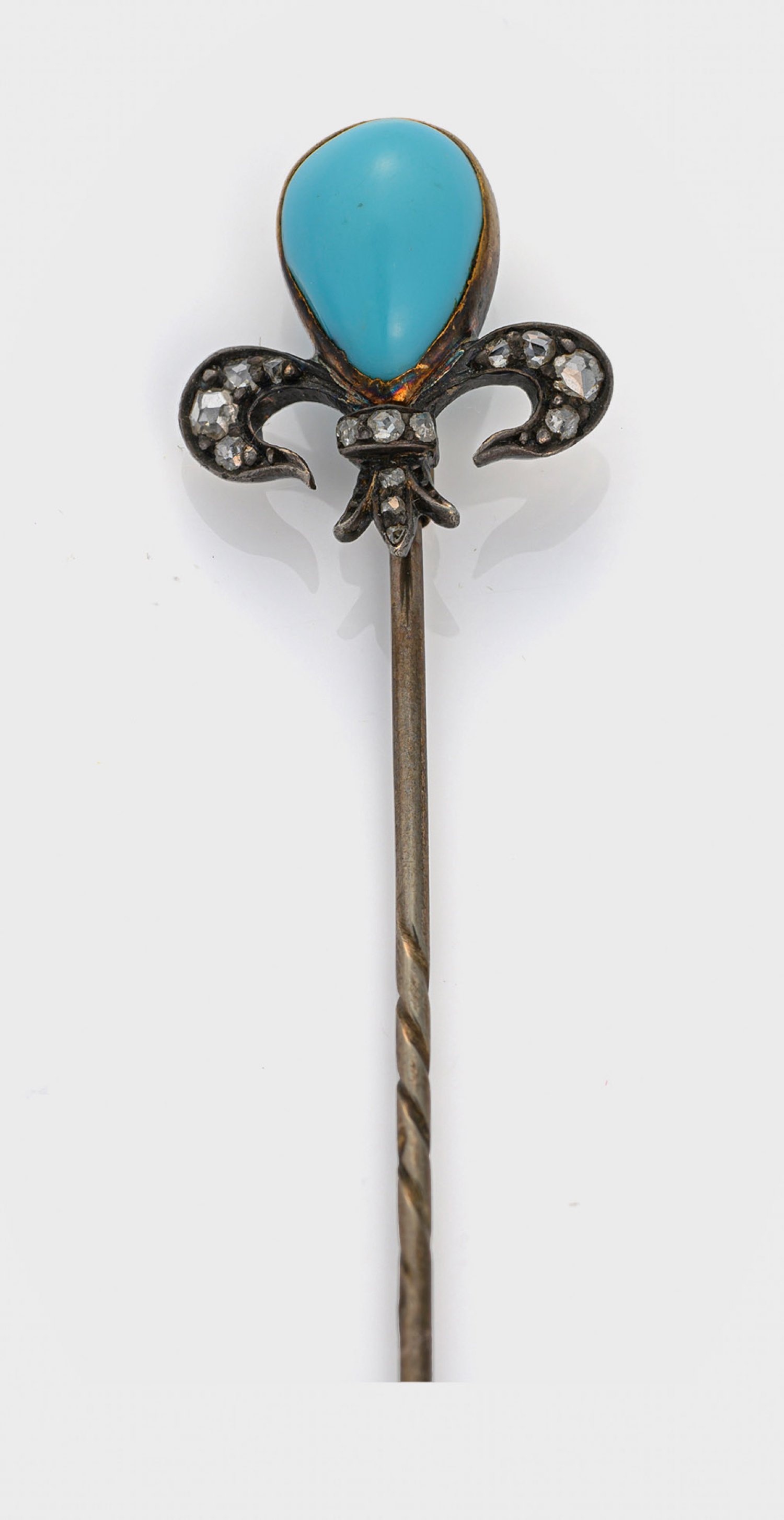 Silber und Gold, 14 ct.; Bekrönung in Form einer stilisierten Lilie mit Türkiscabochon und Diamantrosen. Gew. ca. 2,56 g.