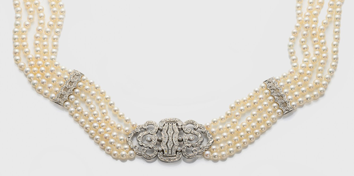Weißgold, gest. 750. 5-reihige Kette aus schneeweißen Zuchtperlen von ca. 4 mm in sehr feinem, rosé-grün changierendem Lüster. Mittig vierpassige Reserve in Ajour, ausgefasst mit kleinen Diamanten, korrespondierende Schließe.