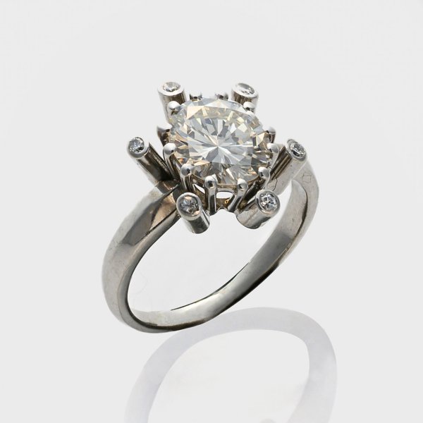 Weißgold, gest. 750. Zentral besetzt mit einem Brillantsolitär von ca. 1,21 ct. (F-G/if) in stilisierter Kronenfassung mit kleinen Brillanten. Herstellerzeichen. Gew. ca. 4,78 g.