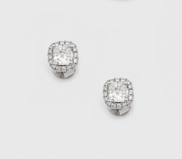 Weißgold, gest. 750. Zentral besetzt mit 2 Diamanten von zus. ca. 0,76 ct. (D-E/vs) im Princesscut, entouriert von kleinen Diamanten von zus. ca. 0,36 ct.; Ges.-Gew. ca. 2,35 g.