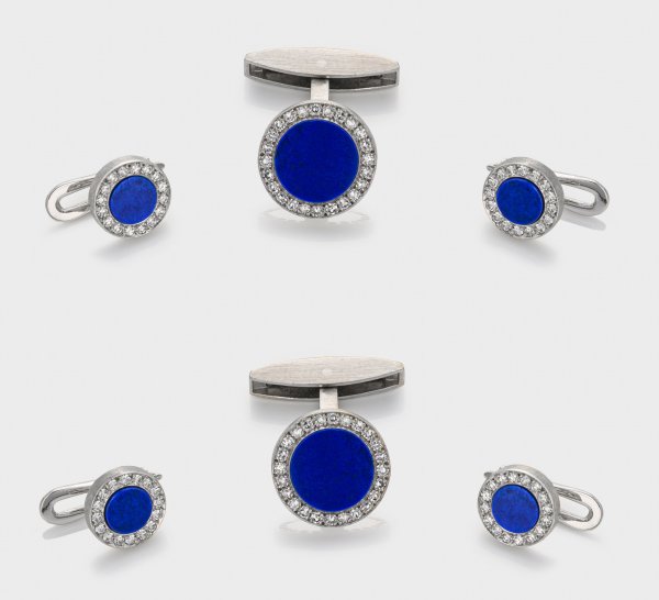 Gentleman's dress coat set, pair of cufflinks and four boutons set with lapislazuli and diamonds approx. 1,60 ct., in 18 k white gold. Manufacturer's mark.