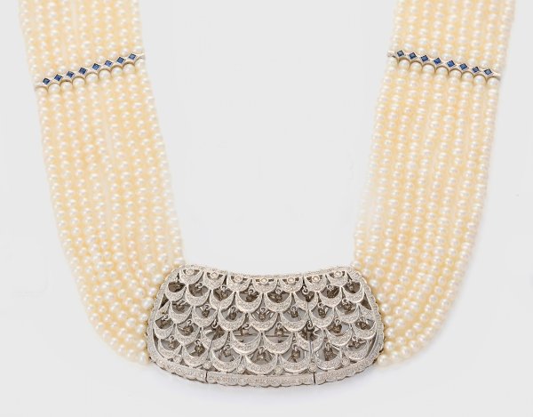 Weißgold, gest. 585. 9-reihig aus weißen Zuchtperlen in Boutonform, in sehr feinem, rosé-grün changierendem Lüster. Zentrale Reserve aus feinen Draperien in Ajour, ausgefasst mit Diamanten von zus. ca. 1,46 ct., schmale Verbindungsglieder mit Saphiren von 0,68 ct.