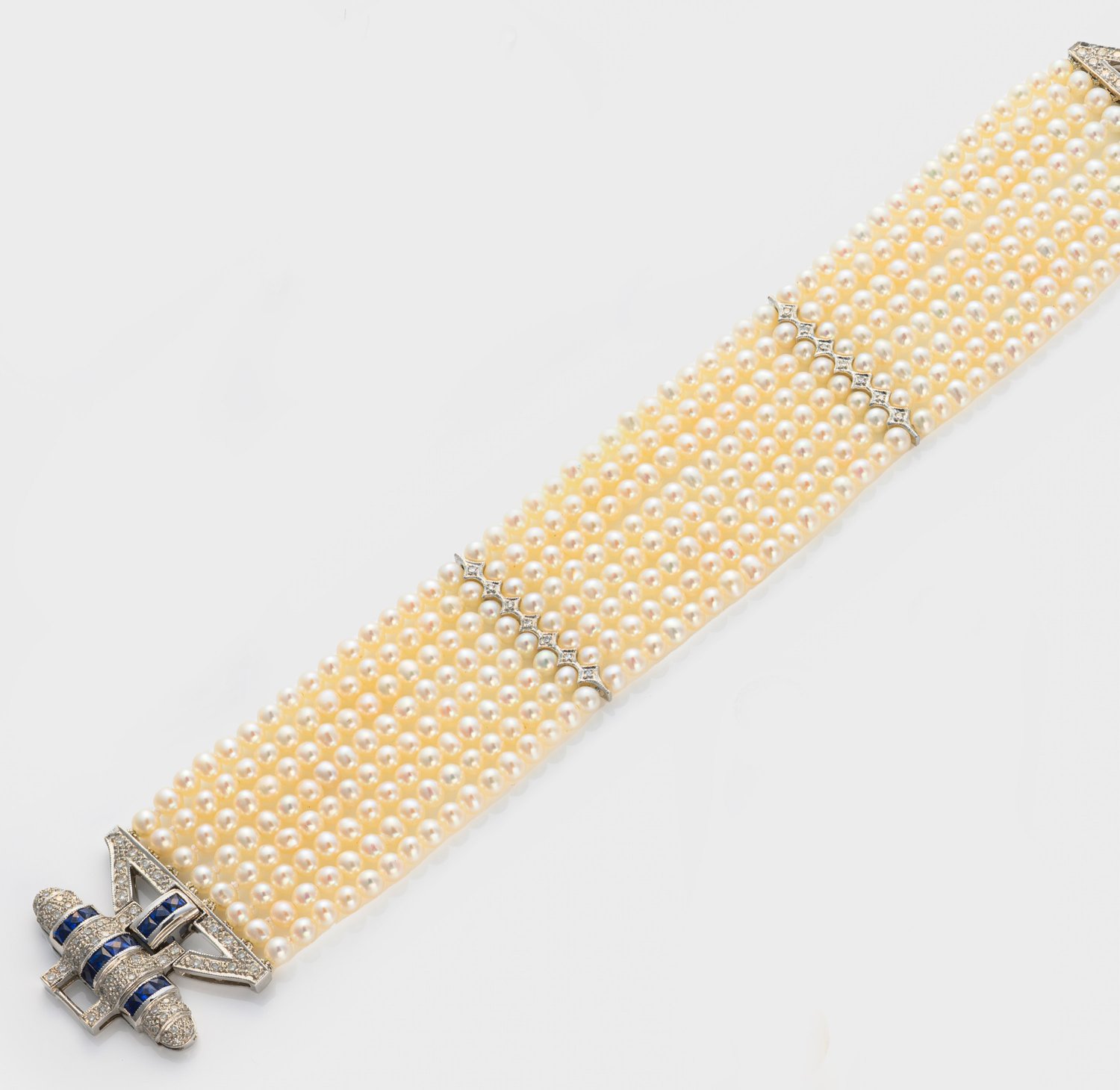 Bracelet set with white cultured pearls approx. 3 mm, clasp with small diamonds and cornflower blue sapphires, in 18 k white gold.