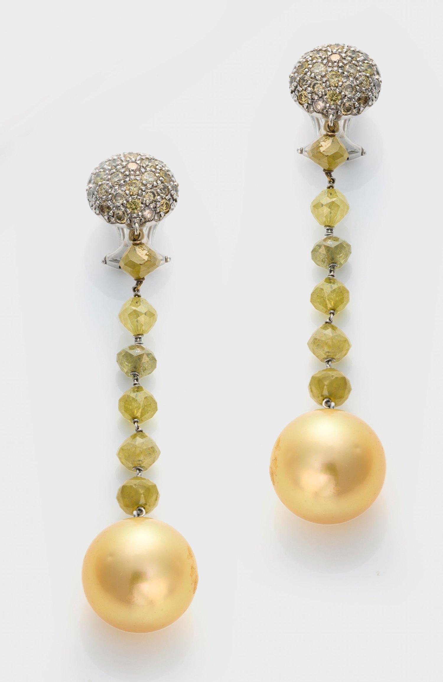 Weißgold, gest. 750. Clipbrisur besetzt mit Fancy Yellow-Diamanten in Pavéfassung, unterhalb feine Gliederkette mit Fancy Yellow-Diamanten von zus. ca. 6,00 ct.; abschließend jeweils eine nahezu makellose Südsee-Zuchtperle von ca. 14 mm in sehr farbintensivem, rosé-grün changierendem Lüster. Ges.-Gew. ca. 16,54 g.