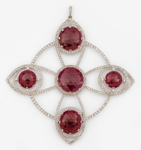 Platin. Schauseitig besetzt mit 5 taubenblutroten Rubinen von zus. ca. 85,89 ct. im Briolettschliff, ausgefasst mit Altschliffdiamanten von zus. ca. 8,00 ct.; Gew. ca. 55,10 g.