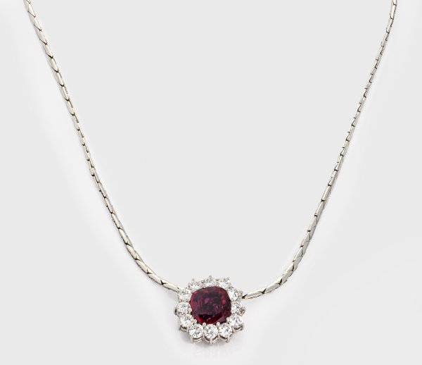 Weißgold, gest. 585. Zentral besetzt mit einem taubenblutroten Rubin von ca. 2,55 ct. im Kissenschliff, entouriert von Brillanten von zus. ca. 1,92 ct. (G/if-vvsi/1xG/I1), an feiner Gliederkette. Ges.-Gew. ca. 12,62 g.