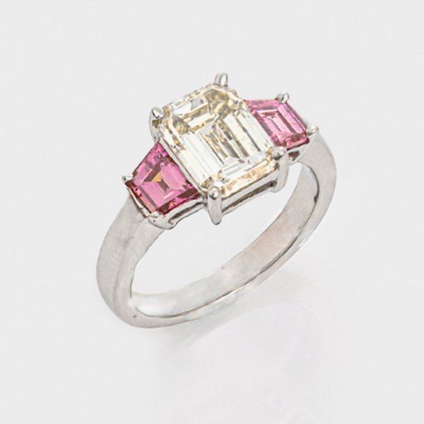 Weißgold, 750. Zentral besetzt mit einem Diamanten von ca. 2,90 ct. (K-L/vs) im Emerald-Variationcut, flankiert von Fancy pinkfarbenen Diamantbaguetten von zus. ca. 1,10 ct. (vs-si). Gew. ca. 6,50 g.
