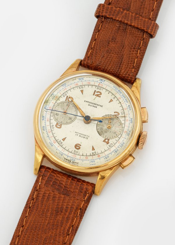 Roségold, gest. 750. Rundes Uhrengehäuse, silbernes Zifferblatt mit Tachymeterskala, kleiner Sekunde und halber Stunde, gebläuter Chronograph aus der Mitte, Lanzenzeiger. Chronograph mit Handaufzug. Feines, cognacfarbenes Lederarmband mit Dornenschließe. Antimagnetic 17 Rubis. Herstellerzeichen. Gew. ca. 43,28 g.