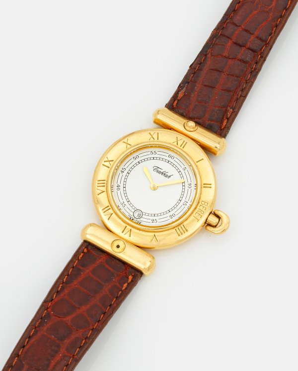 Gelbgold, gest. 750. Rundes, flaches Uhrengehäuse, Lünette mit gravierten römischen Zahlen, weißes Zifferblatt mit Minuterie und Datumsanzeige. Geprägtes Lederarmband mit Gold-Dornenschließe. Quarzwerk. Gew. ca. 39,41 g.