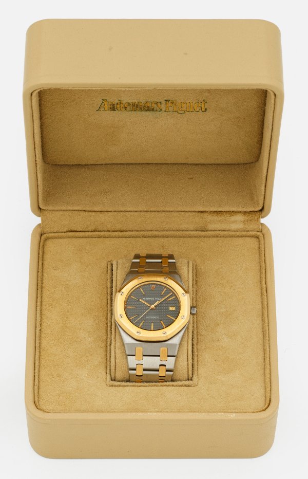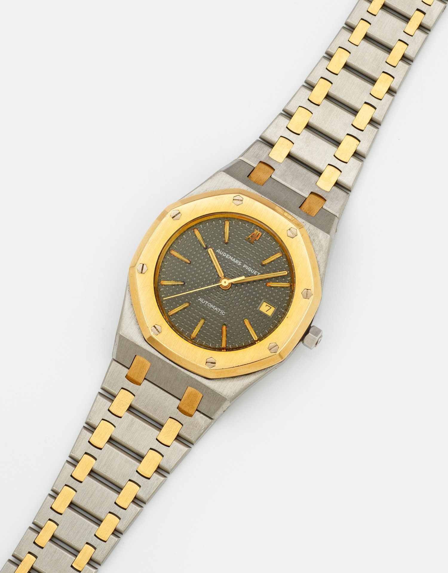 Bicolour-Stahl und Gelbgold, 18 ct.; Rundes Uhrengehäuse mit oktogonale aufgeschraubte Lünette. Zifferblatt mit "Clous de Paris"-Dekor, goldenen Stab-Indexen und Zeigern mit Tritiumauflage. Saphirglas. Automatikwerk. Gliederarmband mit Faltschließe. DN 37 mm. No. 119. Herstellerzeichen. Sandfarbene Audemars Piguet Lederbox.