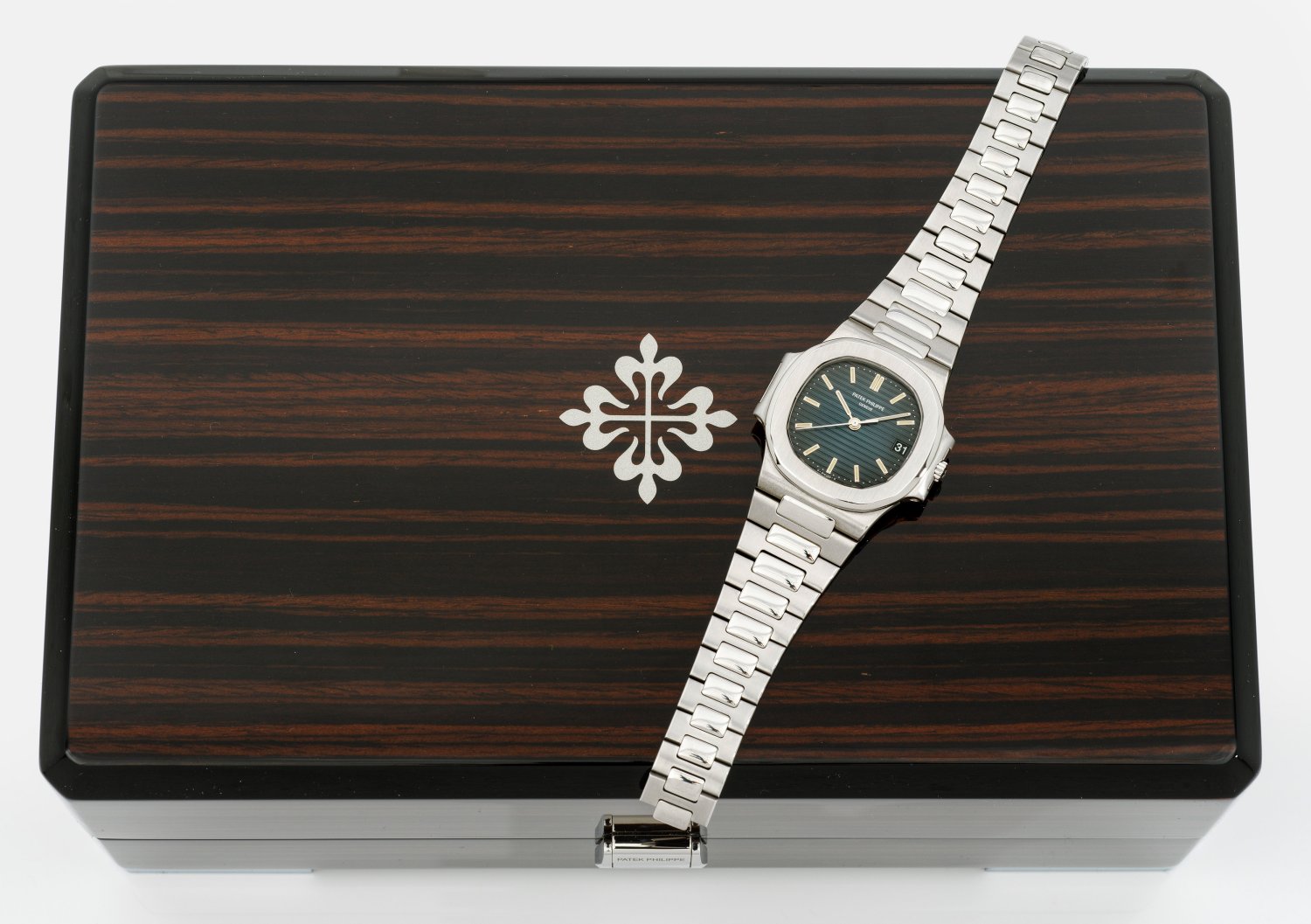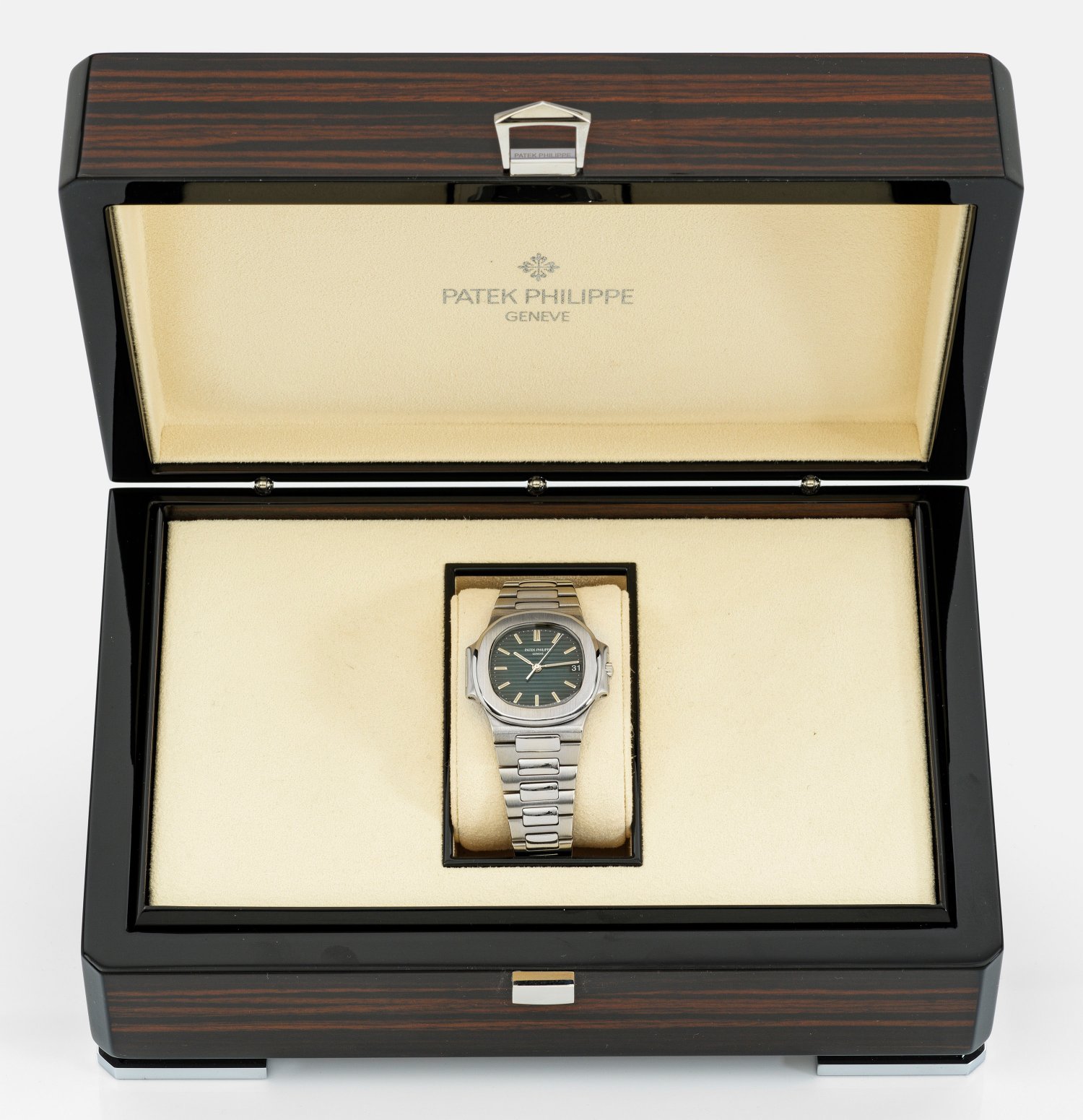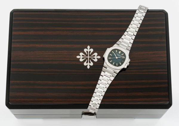 Stahl. Gerundetes, massives Uhrengehäuse, schwarzes Zifferblatt mit erhabenem horizontalen Liniendekor, Indexe und Zeiger mit Tritiumeinlage, Datumsfenster. Verlaufendes Gliederarmband mit doppelter Faltschließe. Automatikwerk. Revision bei Patek Philippe 12/2024. Model-Nr. 3800/01A-010, Serien-Nr. 1426229. D.37,5 mm. Patek Philippe Makassar-Holzbox mit Karton/Staubbeutel/Reise-Etui und Papieren. Altersgemäß sehr guter Erhaltungszustrand. Ges.-Gew. ca. 93,59 g.;