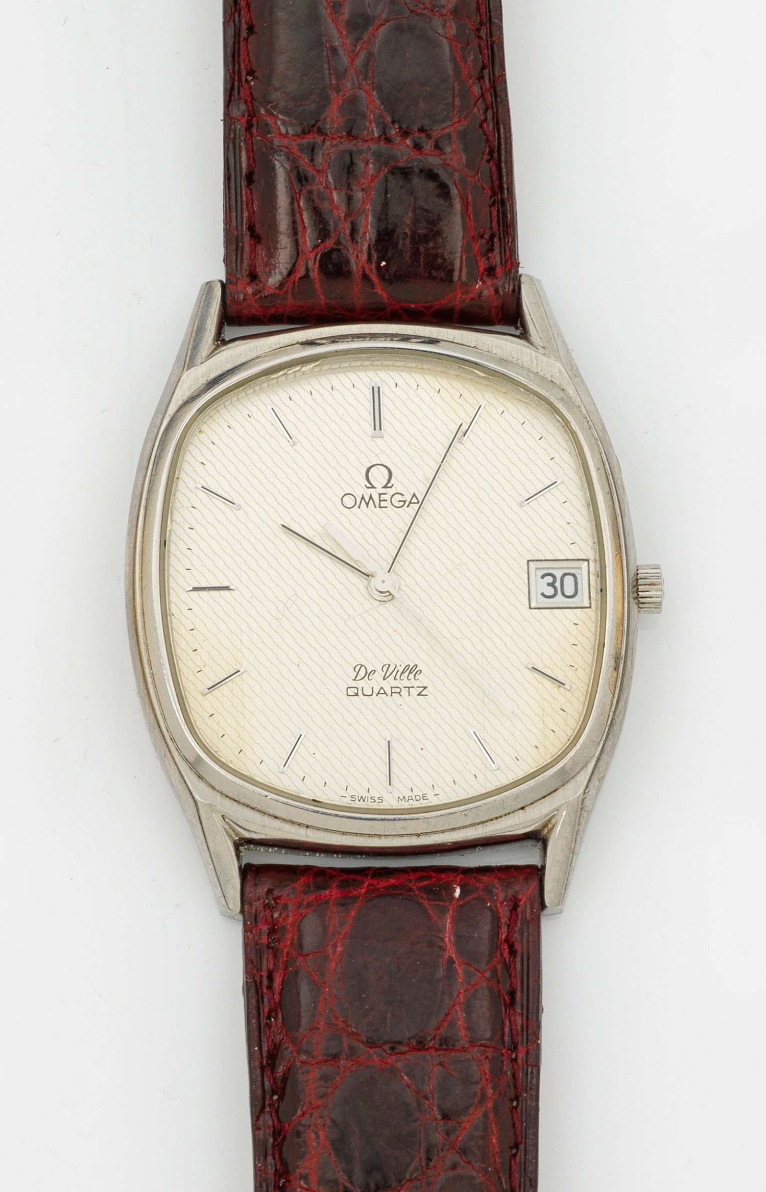 Stahl. Profiliertes Uhrengehäuse, fein strukturiertes Zifferblatt, Stabindexe und Zeiger, Datumsanzeige. Quarzwerk. Feines, bordeauxfarbenes Lederarmband mit Dornenschließe. Herstellerzeichen. Original Box.