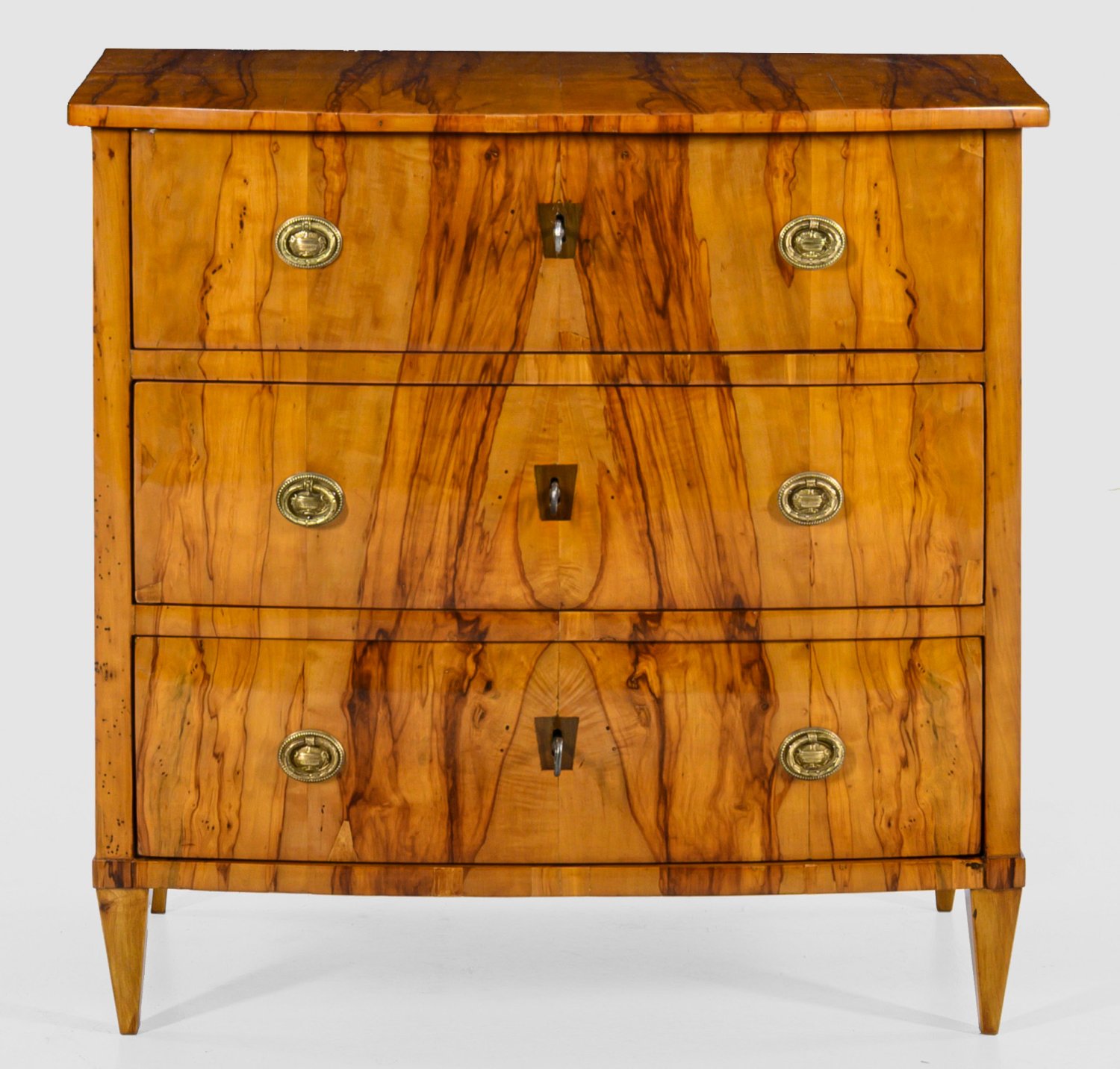Apfelholz, furniert. Gerader, hochrechteckiger Korpus auf konischen Vierkantbeinen. In der gegliederten Front drei bombierte Schubladen. Gering überstehende Deckplatte. Flächendeckende Furnierfelder. Rest.; H. 72,5 cm. 74,5 cm x 42 cm.