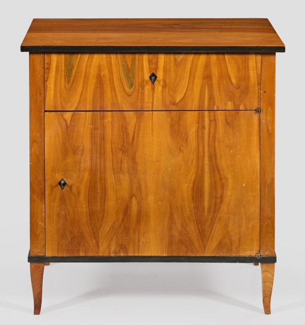 Kirschbaum, furniert und teilw. ebonisiert. Gerader, rechteckig angelegter Korpus auf schmaler Zarge und leicht geschweiften Vierkantbeinen. In der gegliederten Front große Tür sowie oberhalb Schubfach. Gering überstehende Deckplatte. Rest. mit Erg.; H. 79 cm. 74,5 cm x 42,5 cm.