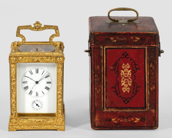 Bronze, vergoldet. Facettverglaster Korpus aus blattreliefierten Streben auf korrespondierendem Sockel. Scharnierter Griff. Weißes Emailzifferblatt mit römischen schwarzen Zahlen sowie Weckeinstellung. Werk mit Echappement, Weckfunktion und Repetition. Platine bez. Japy Frères. Ges.-H. 18 cm. Rechteckiges, verglastes Etui mit siegelroter Lederbespannung.