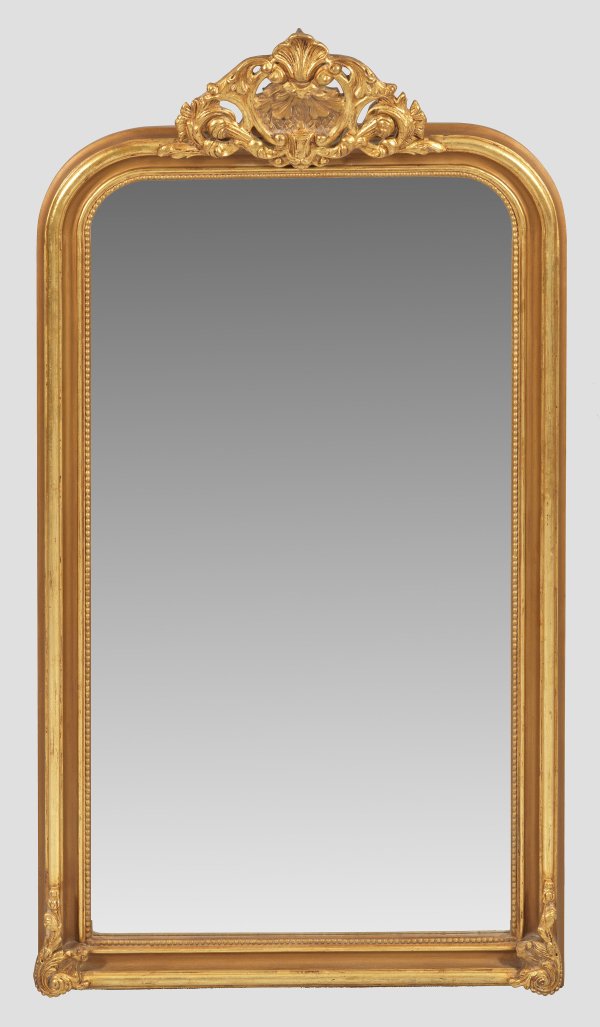 Holz, stuckiert und vergoldet. Hochrechteckige, profilierte Spiegelrahmung mit Perlstabfries und gewölbtem oberen Abschluss. Vorkragende, durchbrochen gearbeitete Bekrönung aus zentraler Blattkartusche, flankiert von Voluten. Facettiertes Spiegelglas. 169 cm x 90 cm.