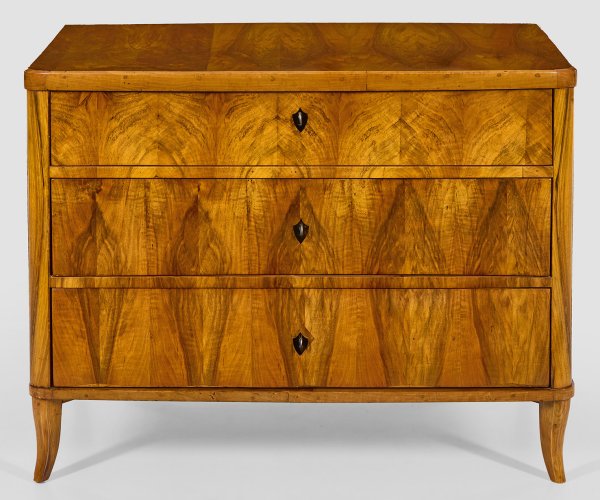 Nussbaum, furniert. Gerader, querrechteckig angelegter Korpus auf schmaler Zarge und schräggestellten, leicht geschweiften Beinen. In der gegliederten Front drei Schubladen. Gering überstehende Deckplatte. Rest.; H. 83 cm. 109 cm x 59 cm.