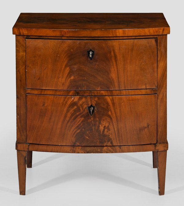Mahagoni, furniert. Gerader, hochrechteckig angelegter Korpus auf schmaler Zarge und konischen Vierkantbeinen. In der gegliederten Front zwei bombierte Schubladen. Gering überstehende Deckplatte. H. 73,5 cm. 65,5 cm x 42,5 cm.