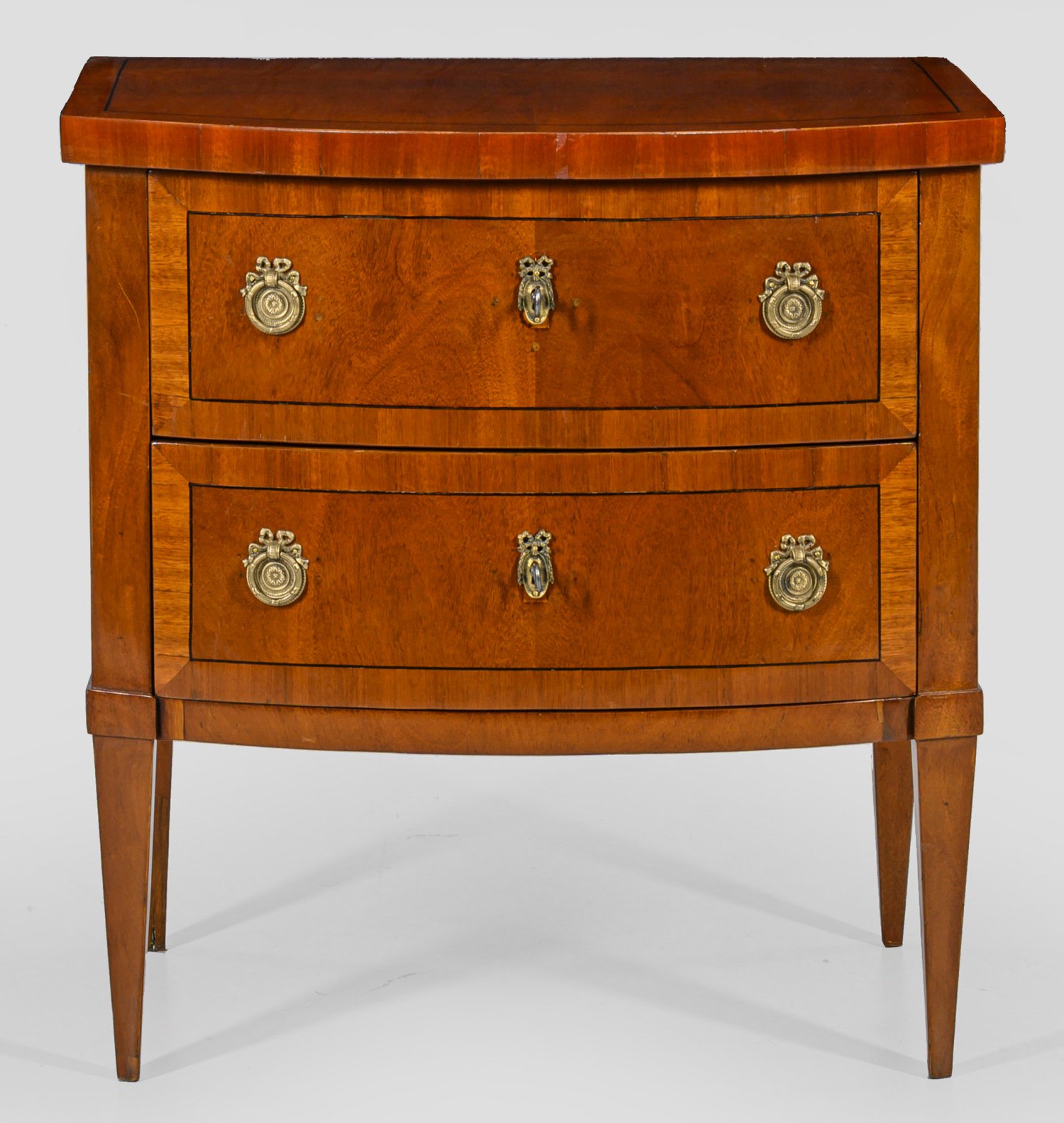 Helles Mahagoni, furniert. Gerader Korpus auf schmaler Zarge und konischen Vierkantbeinen. In der gegliederten Front zwei bombierte Schubladen. Gering überstehende Deckplatte. H. 76 cm. 72 cm x 47 cm.