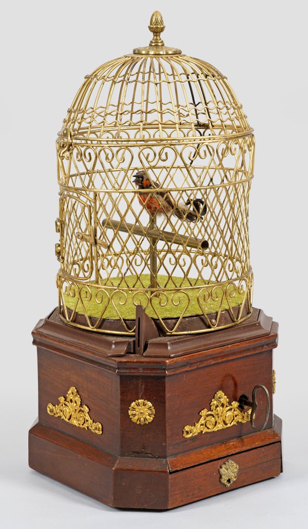 sog. Singvogelkäfig. Mahagoni, furniert sowie vergoldetes Metall. Gekanteter Sockel für hohen Vogelkäfig aus Gitterwerk. Innen ein Singvogel mit echten Vogelfedern, auf einer Stange sitzend. Seitlich Münzeinwurf und Schlüsselaufzug. Erg.; Überholungsbedürftig. H. 52 cm.