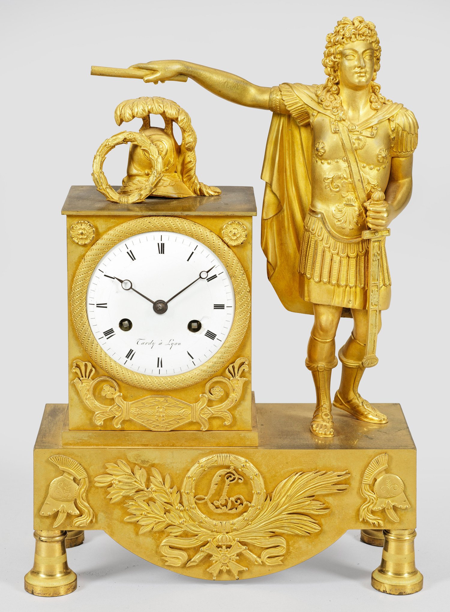 Bronze, vergoldet. Über querrechteckig angelegtem Korpus auf kräftigen Balusterfüßen vollplastische Darstellung Ludwig XIV. als römischer Kaiser. Rechteckiges Uhrengehäuse mit profilgerahmtem Emailzifferblatt, bez. Tardy à Lyon. Pendulenwerk mit Fadenaufhängung sowie Halbstundenschlag auf Glocke. H. 32,5 cm. 22 cm x 9 cm.