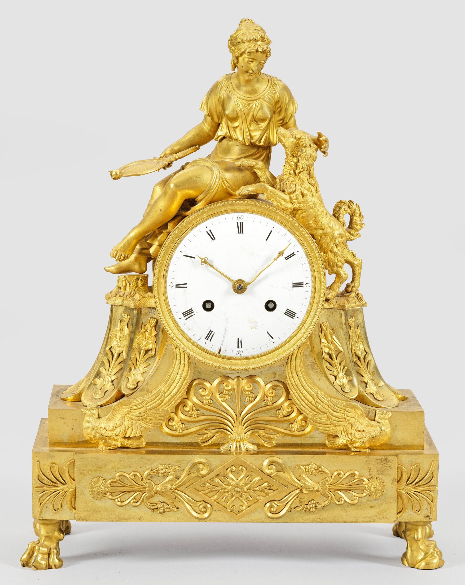 Bronze vergoldet. Über querrechteckig angelegtem Sockel auf Tatzenfüßen geschweift ansteigendes Uhrengehäuse mit applizierten Fasanen. Vollplastische Bekrönung einer jungen antikisierend gekleideten Dame mit Spiegel und Hund. Profilgerahmtes Emailzifferblatt. Pendulenwerk mit Fadenaufhängung sowie Halbstundenschlag auf Glocke. Pendel fehlt. H. 42,5 cm. 33,5 cm x 12,5 cm.