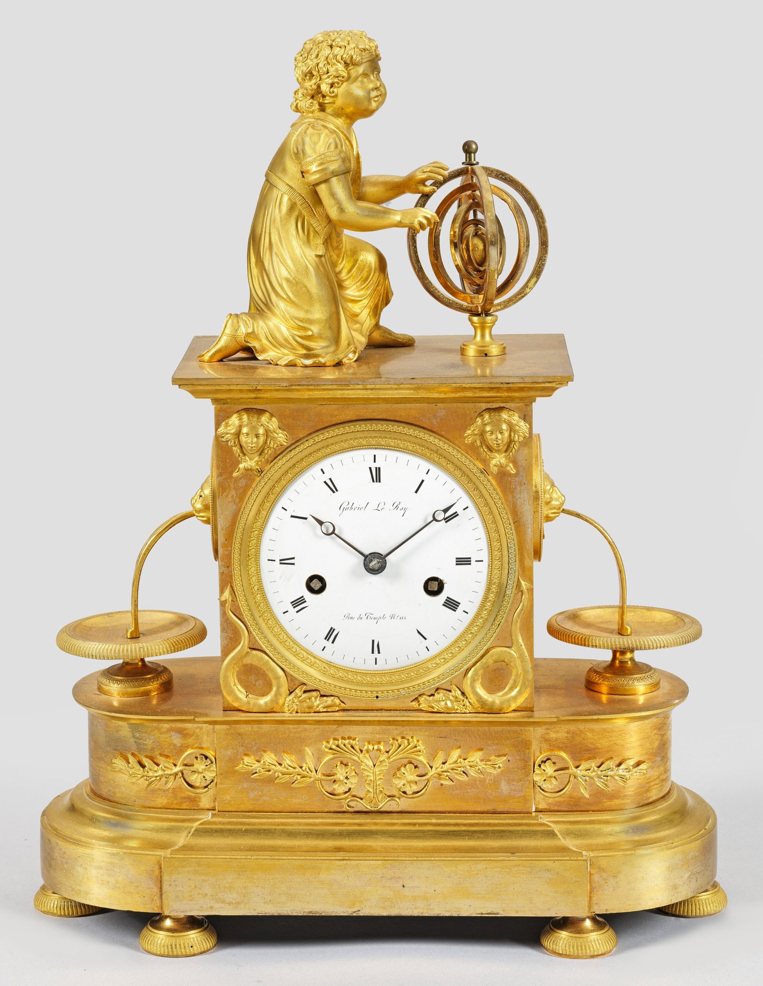 Bronze, fein ziseliert und vergoldet. Über bombiertem Profilsockel hochrechteckiges Uhrengehäuse, flankiert von Löwenmaskarons als Wasserspeier. Profilgerahmtes Emailzifferblatt, bez. Gabriel Le Roy. Vollplastische Bekrönung in Gestalt eines Kindes mit Globus. Pendulenwerk mit Fadenaufhängung sowie Halbstundenschlag auf Glocke. H. 36,5 cm. 28 cm x 12 cm.