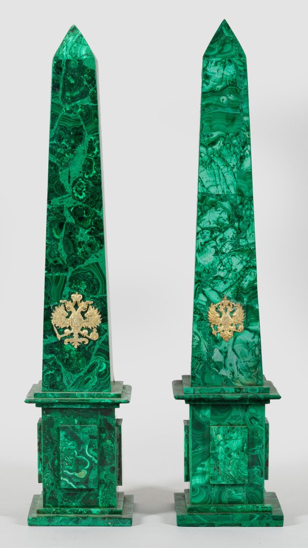 A pair of representative Russian malachite obelisks, set with a gilt silver imperial eagle. Standard mark 84.
