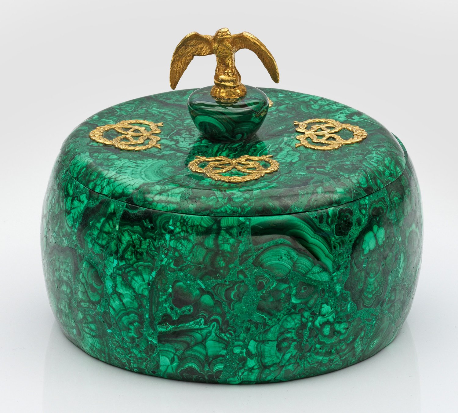 A large Russian malachite box, set with a gilt silver imperial eagle. Standard mark 84.