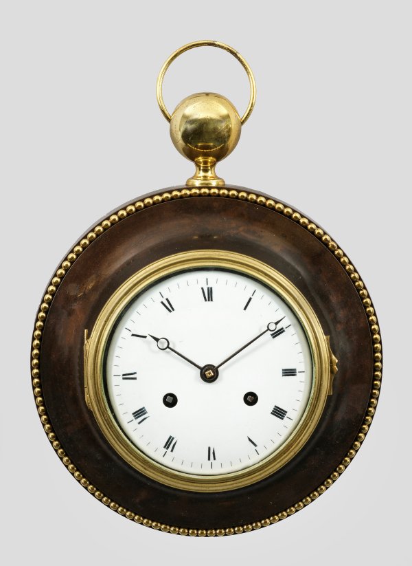 Bronze, dunkel patiniert und teilw. vergoldet. Rundes Uhrengehäuse mit umlaufendem Fries aus Perlstab. Vorkragendes, profilverglastes Emailzifferblatt mit römischen Zahlen. Kugelabschluss mit Ringaufhängung. Pendulenwerk mit Fadenaufhängung sowie Halbstundenschlag auf Glocke. Ges.-H. 33 cm.