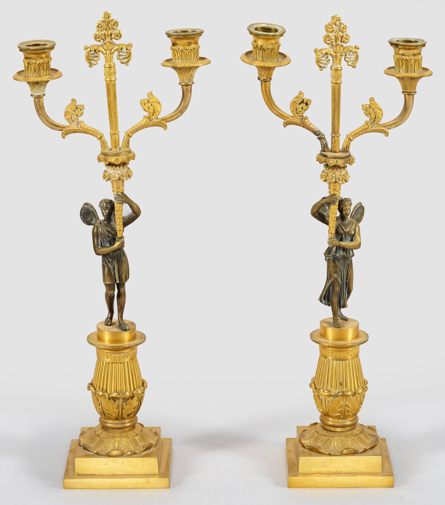 Gegenstücke. 2-flg.; Bronze, vergoldet und teilw. patiniert. Über gestuft ansteigender Basis kräftiger, teilw. godronierter und blattreliefierter Balustersockel als Träger für vollplastisch gestaltete Genienfiguren mit Füllhorn. Oberhalb davon ausgehend geschwungene Leuchterarme mit zylinderförmigen Tüllen. H. 44 cm.