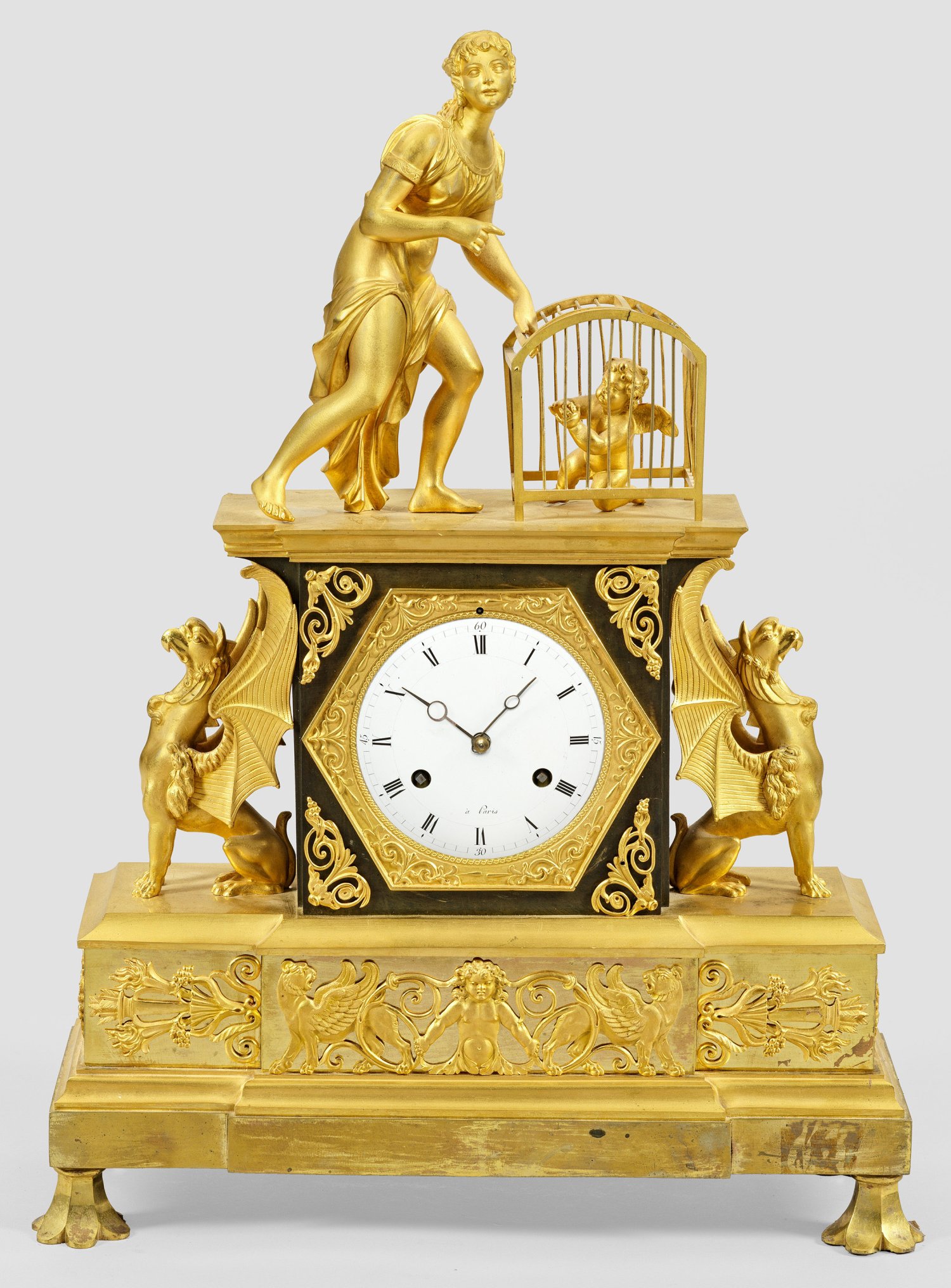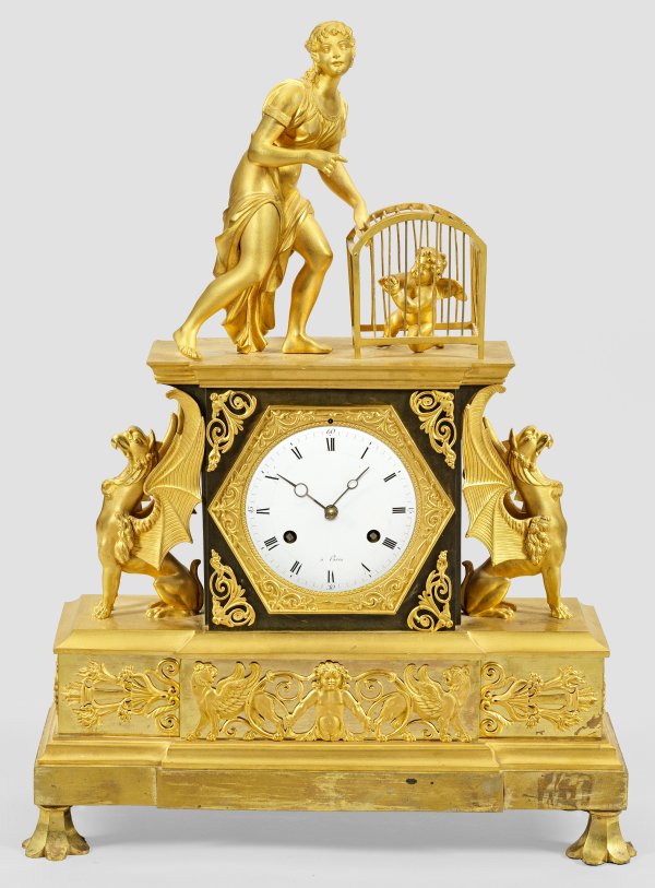 Bronze, fein ziseliert, feuervergoldet und teilw. dunkel patiniert. Über querrechteckig angelegtem Profilsockel mit applizierten Palmetten und Chimären rechteckiges Uhrengehäuse, flankiert von plastischen Chimären. Profilgerahmtes Zifferblatt, bez. à Paris. Vollplastische Bekrönung in Gestalt einer allegorischen Figur sowie eines in einem Käfig gefangenen Amorknaben. Pendulenwerk mit Fadenaufhängung. H. 54 cm. 39 cm x 13 cm.
