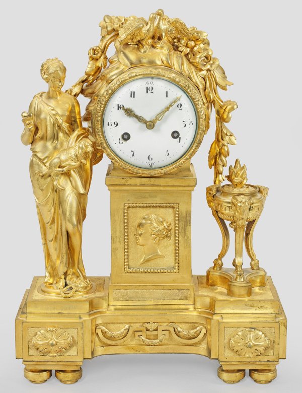 Bronze, feuervergoldet. Querrechteckig angelegt, in der Front konkav eingezogene Basis mit applizierten Blattrosetten auf gedrückten Füßen. Oberhalb gekanteter Podestsockel mit Porträtrelief als Träger für rundes Uhrengehäuse. Bekrönung aus schnäbelndem Taubenpaar, Wolken und üppigen Blüten. Daneben allegorische Darstellung einer weiblichen Figur mit einem Hund als Sinnbild für die Treue. Pendulenwerk mit Fadenaufhängung und Halbstundenschlag auf Glocke. H. 43 cm. 31 cm x 13 cm.