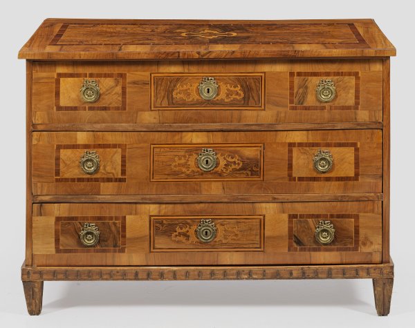 Nussbaum, furniert sowie Einlagen aus Ahorn und Pflaumenholz. Gerader, querrechteckig angelegter Korpus auf schmaler Zarge und konischen Vierkantbeinen. In der gegliederten Front drei breite Schubladen. Gering überstehende Deckplatte. Flächendeckend breit gerahmte Furnierfelder, teilw. mit intarsierten Rocaillen, von Bandeinlagen begrenzt. H. 88 cm. 120 cm x 58,5 cm.
