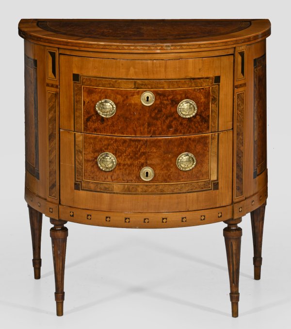 Kirschbaum und Thujamaser, furniert sowie Einlagen aus unterschiedlichen Hölzern. Bombierter Korpus, flankiert von schmalen Lisenen, auf schlanken Balusterbeinen. In der gegliederten Front zwei optisch verbundene Schubladen sans traverse. Gering überstehende Deckplatte. Flächendeckend breit gerahmte Furnierfelder, von Bandeinlagen begrenzt. Erg.; H. 76,5 cm. 72,5 cm x 46 cm.