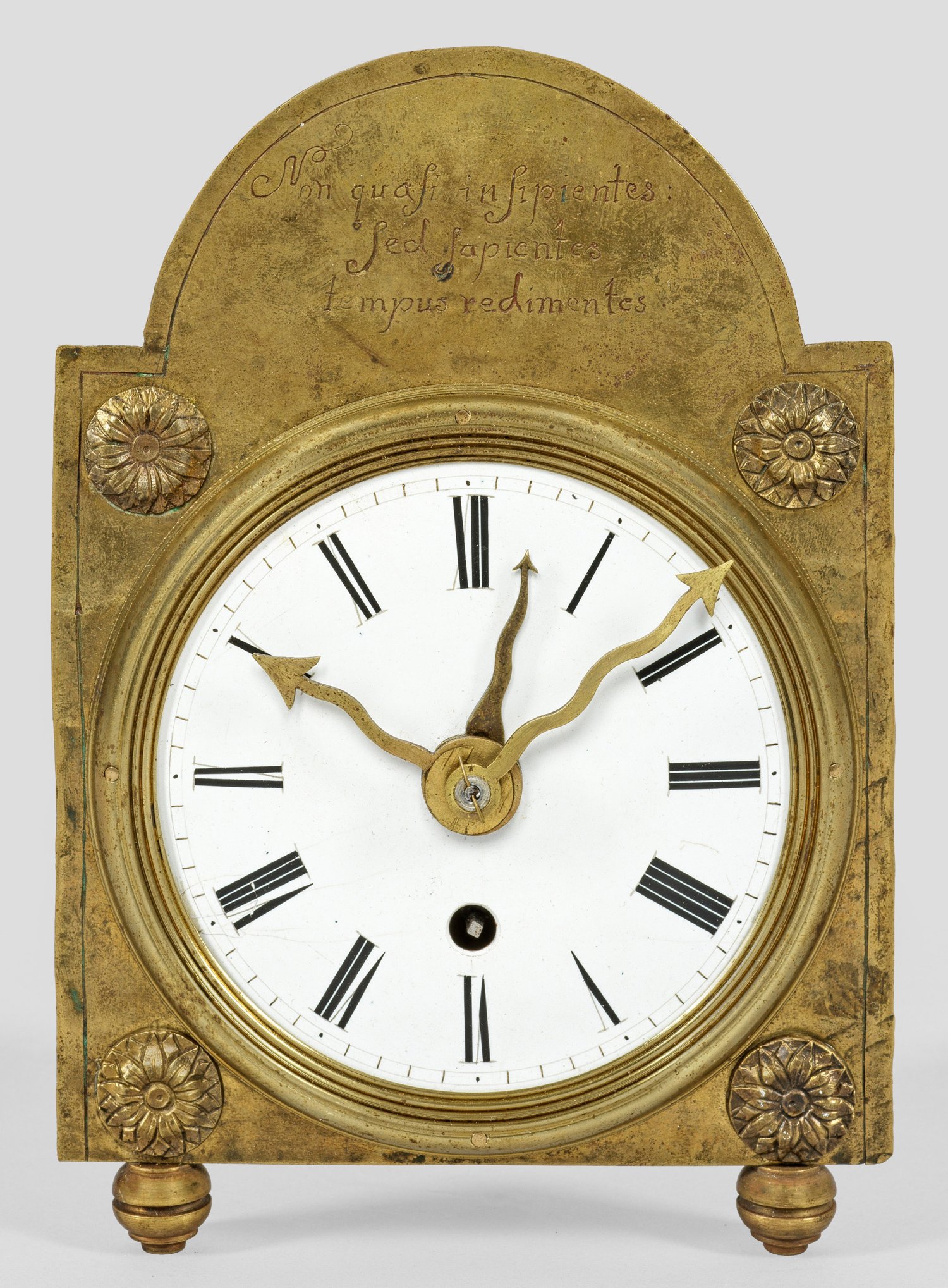 Messing. Gerade, hochgewölbte Front mit Emailzifferblatt sowie oberhalb lateinischer Sinnspruch. Mechanisches Werk mit Hinterzappler, Spindelhemmung sowie Fadenaufzug für Weckfunktion. Platine bez. Sebastian Wagner, Erpfendorf, No. 56. H. 17,5 cm. 12 cm x 5,5 cm.