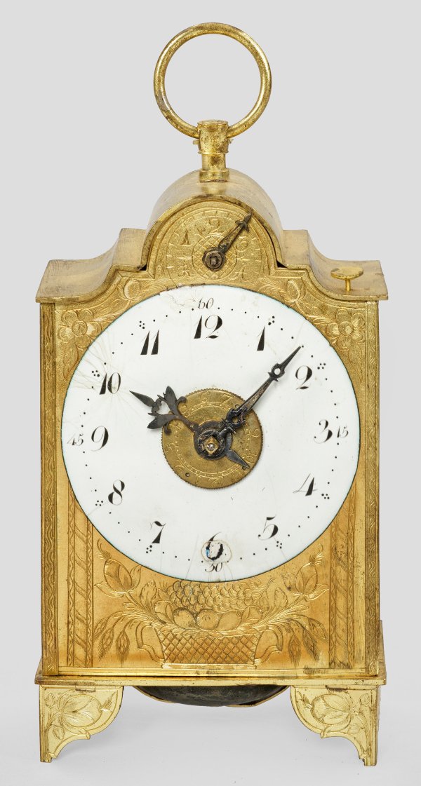 Messing, fein reliefiert und vergoldet. Hochrechteckiges Uhrengehäuse mit geschweift ansteigendem oberen Abschluss sowie reliefiertem Fruchtkorb und Festonmotiven. Besch. Emaillezifferblatt mit Weckscheibe. Mechanisches Werk mit Spindelhemmung, Kette und Schnecke. Stundenschlag und Weckfunktion mit bodenseitiger Glocke. Repetition. H. 20 cm. 9,5 cm x 6,5 cm.