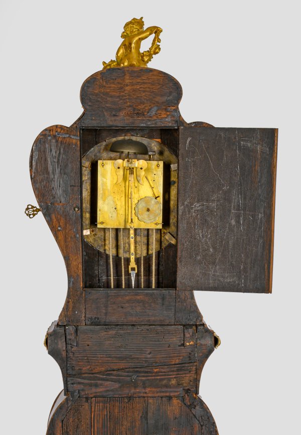 Rosenholz, furniert sowie Einlagen aus unterschiedlichen Edelhölzern und Applikationen aus vergoldeter Bronze. Über gekantetem Profilsockel balusterförmiger, eintüriger Korpus mit profilgerahmtem Pendelfenster. Korrespondierender Uhrenkopf mit plastischer Puttenbekrönung sowie verglastem Zifferblatt mit Datumsanzeige sowie Sekundenanzeige mit einem doppelten 30-Sekunden-Sektor, bez. Thiout L'ainé, Paris. Mechanisches Werk mit Halbstundenschlag auf Glocke. Rest. mit Erg.; H. 208 cm.