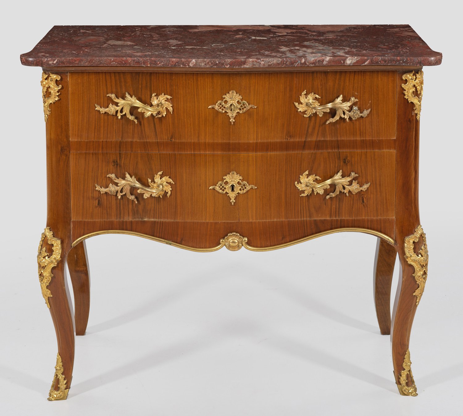 Nussbaum, massiv und furniert sowie Applikationen aus vergoldeter Bronze. Querrechteckig angelegter Korpus mit gerundeten Ecken, in hohe, geschwungene Beine übergehend. In der gegliederten Front zwei gering geschweifte Schubladen. Deckplatte aus bordeauxrotem gemasertem Marmor. Erg.; H. 89,5 cm. 105 cm x 60 cm.