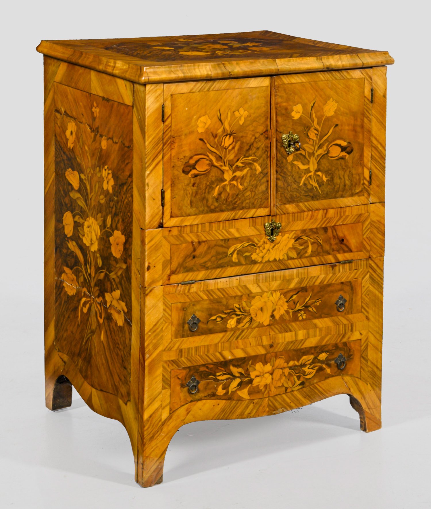 Nussbaum, furniert sowie aufwändige Marketerie aus unterschiedlichen, teilw. gefärbten Hölzern. Gerader, hochrechteckig angelegter Korpus mit geschweiftem unteren Abschluss, in gesägte Füße übergehend. In der gegliederten Front zwei Türen sowie unterhalb abklappbare Lade und zwei Blendschubladen. Gering überstehende Deckplatte. Breit gerahmte Furnierfelder mit üppigen Blütenintarsien sowie rückseitig Rautendekor. H. 75 cm. 55 cm x 46 cm.