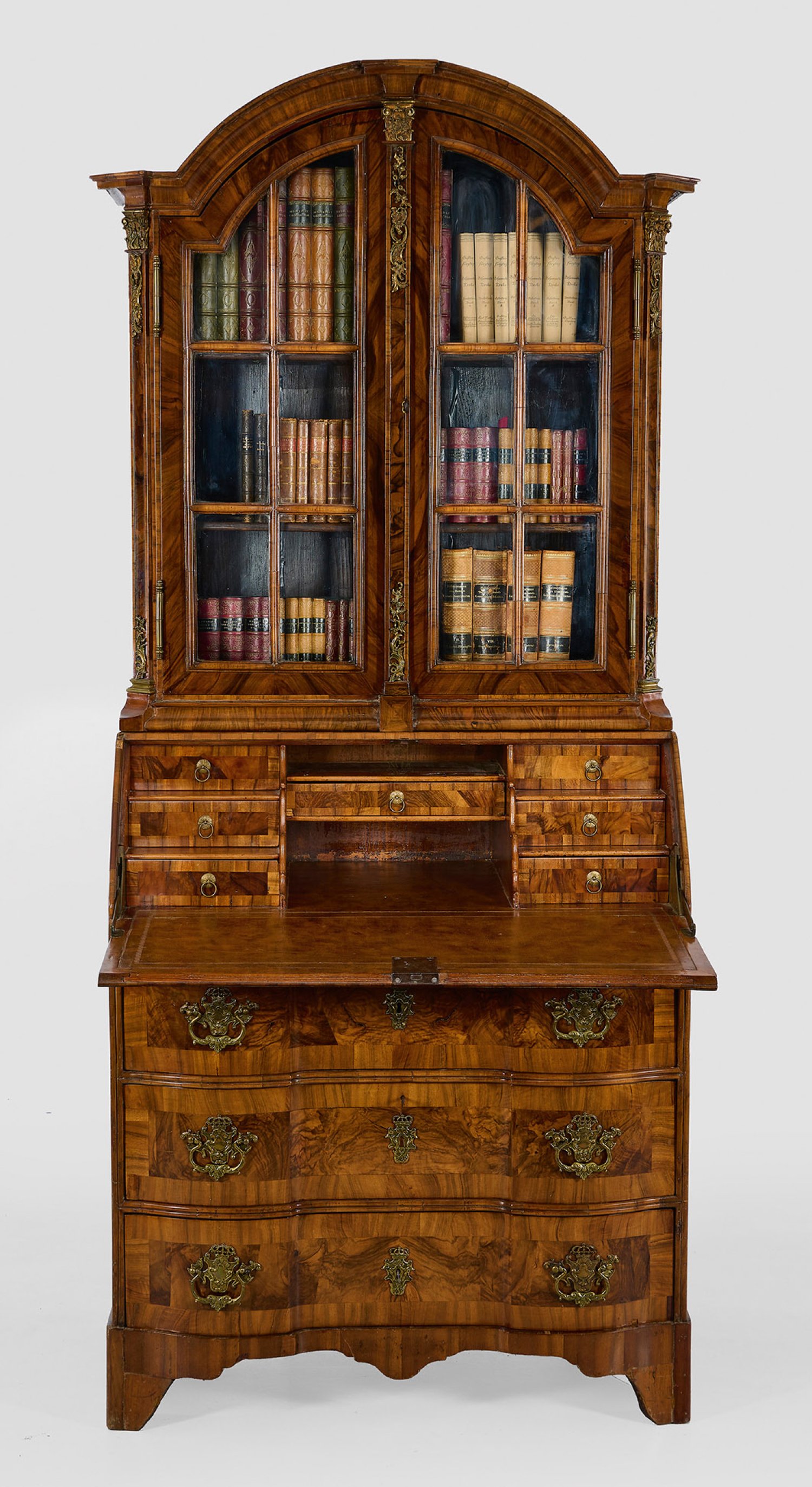 Nussbaum und Nussbaummaser, furniert sowie Applikationen aus vergoldeter Bronze. Gerader Korpus auf gesägten Füßen. In der gegliederten Front drei gegenläufig geschweifte Schubladen sowie schräggestellte, abklappbare Arbeitsfläche. Dahinter gestaffelte Facheinteilung. Oberhalb korrespondierender, zweitürig sprossenverglaster Vitrinenaufsatz, flankiert von schräggestellten Ecklisenen mit reliefierten Basen und Kapitellen. Gekehltes Gesims mit segmentförmigem Abschluss. H. 227 cm. 104 cm x 60 cm.