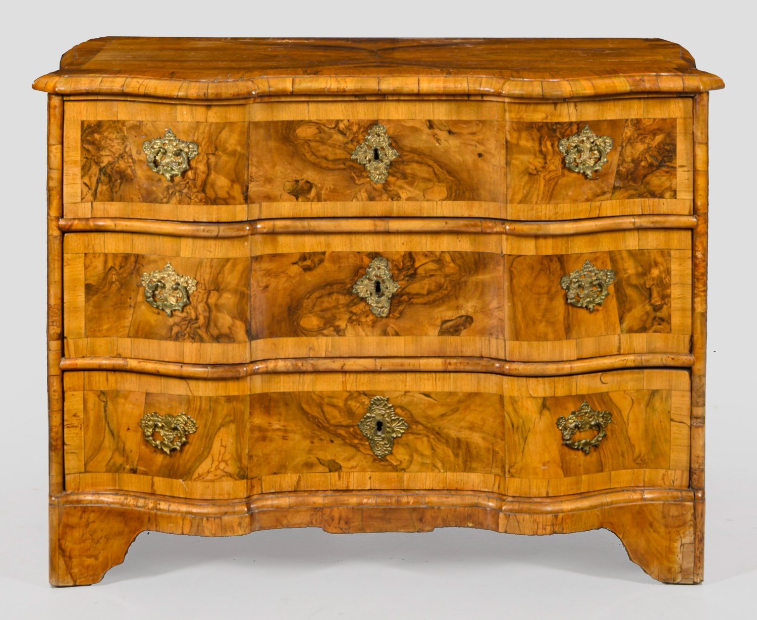 Nussbaum, furniert. Gerader, rechteckiger Korpus mit schmalen, gerundeten Ecken auf flacher Zarge und gesägten Füßen. In der gegliederten Front drei breite, gegenläufig geschweifte Schubladen. Gering überstehende, profilierte Deckplatte. Flächendeckend breit gerahmte Furnierfelder, von Bandeinlagen begrenzt. Rücks. zwei Siegelreste. H. 80 cm. 110 cm x 60 cm.