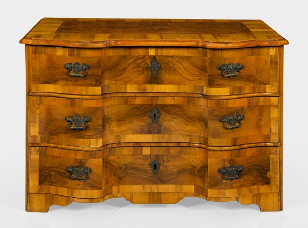 Nussbaum, furniert. Gerader, querrechteckig angelegter Korpus mit ausgebogter Zarge auf entsprechenden Füßen. In der gegliederten Front drei breite, gegenläufig geschweifte Schubladen. Gering überstehende, profilierte Deckplatte. Flächendeckend breit gerahmte Furnierfelder. Erg.; In der Schublade Etikett M 217. H. 81 cm. 121 cm x 64,5 cm.