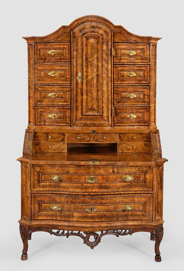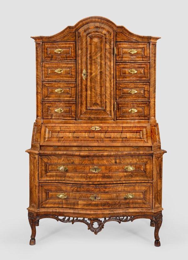 Nussbaum, furniert sowie teilw. reliefplastisch geschnitzt. Querrechteckig angelegter Korpus mit wulstartig gerahmten Kassettenfüllungen auf passig geschweifter, durchbrochen gearbeiteter Zarge aus üppigen Voluten, in geschweifte Beine mit Bocksfüßen übergehend. In der gegliederten Front zwei breite Schubladen, flankiert von schräggestellten Ecklisenen sowie entsprechender Sekretärteil mit schräggestellter, abklappbarer Arbeitsfläche. Dahinter gestaffelte Facheinteilung. Oberhalb korrespondierender Aufsatz mit gestreckter Tabernakeltür, flankiert von Schubfächern sowie geschweift ansteigendem Kehlgesims. H. 207 cm. 126 cm x 70 cm.